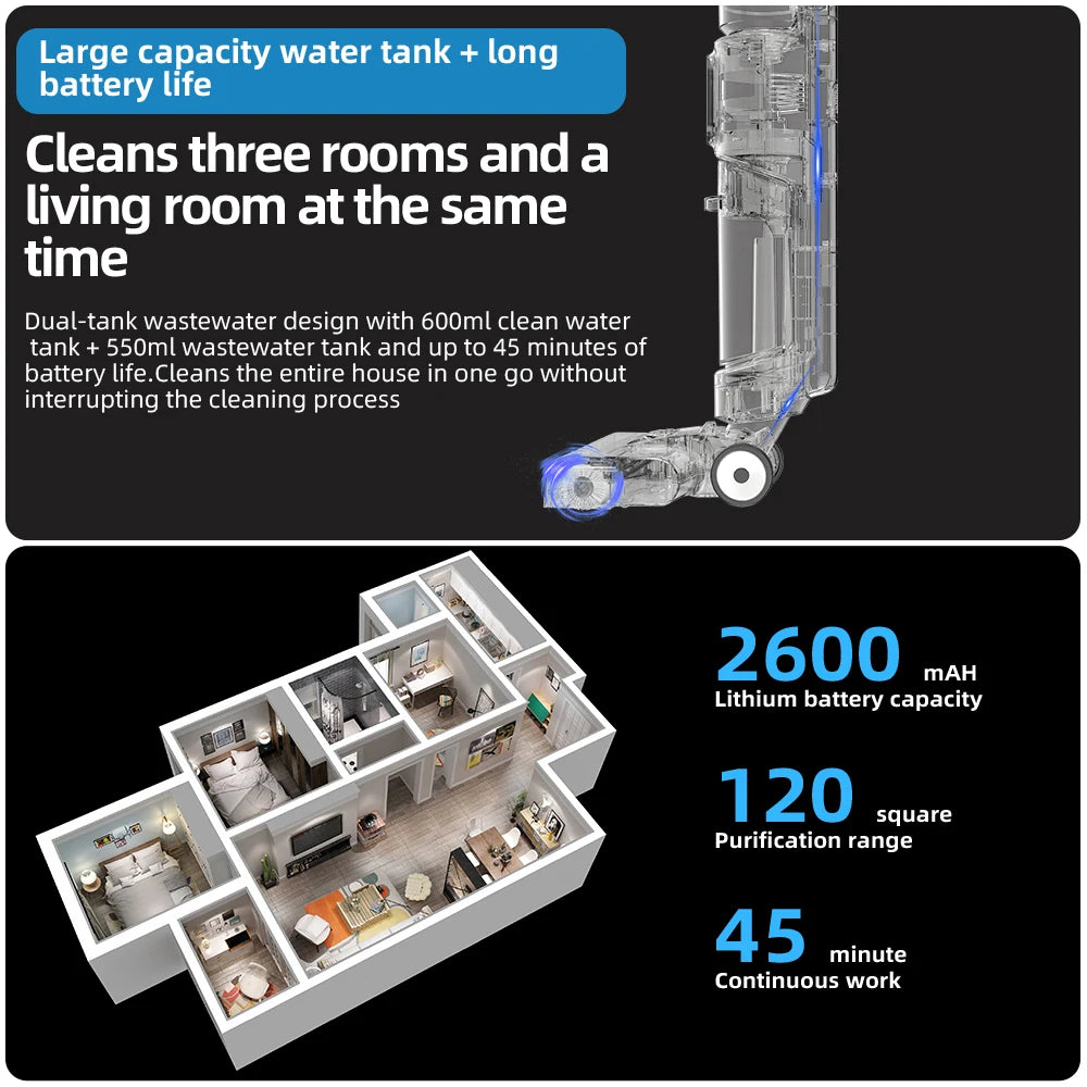 3 in 1 vacuum mopVacuuming, mopping and drying in one step; The vacuum cleaner with mopping function only needs to be charged once, can work continuously for 45 minutes and thoroughly clean a 200 square meter room. for tile, laminate, marble and hardwood floors; light and comfortable, quiet and powerful suction.